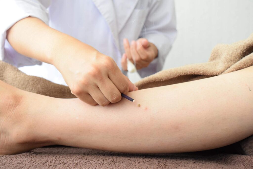 局所鍼灸と全身鍼灸の組み合わせです。全身から血流をよくしながらも、お辛い局所部位にも鍼の本数、お灸の箇所を増やして集中して鍼灸を行います。